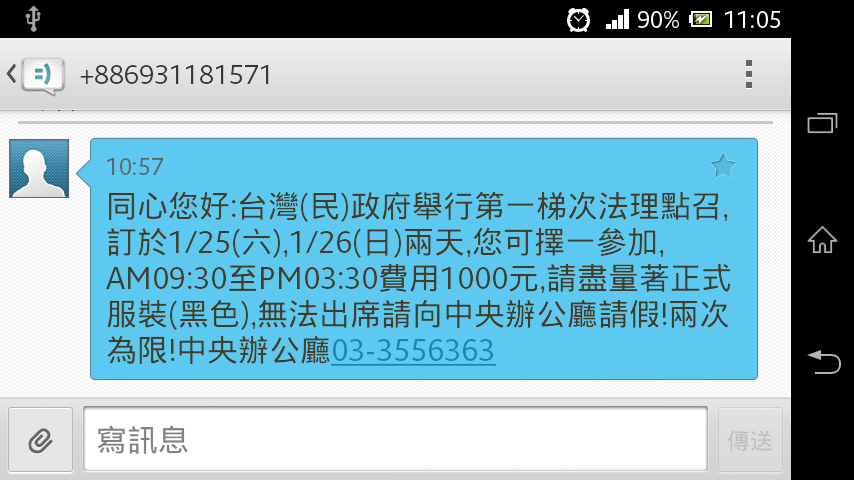 台灣民政府中央辦公廳決定:自2014年1月25、26日起舉行第一次「同心法理點召」,共分成8梯次,凡接獲「同心法理點召令」者,請準時赴會。以上適格人員計3500名。